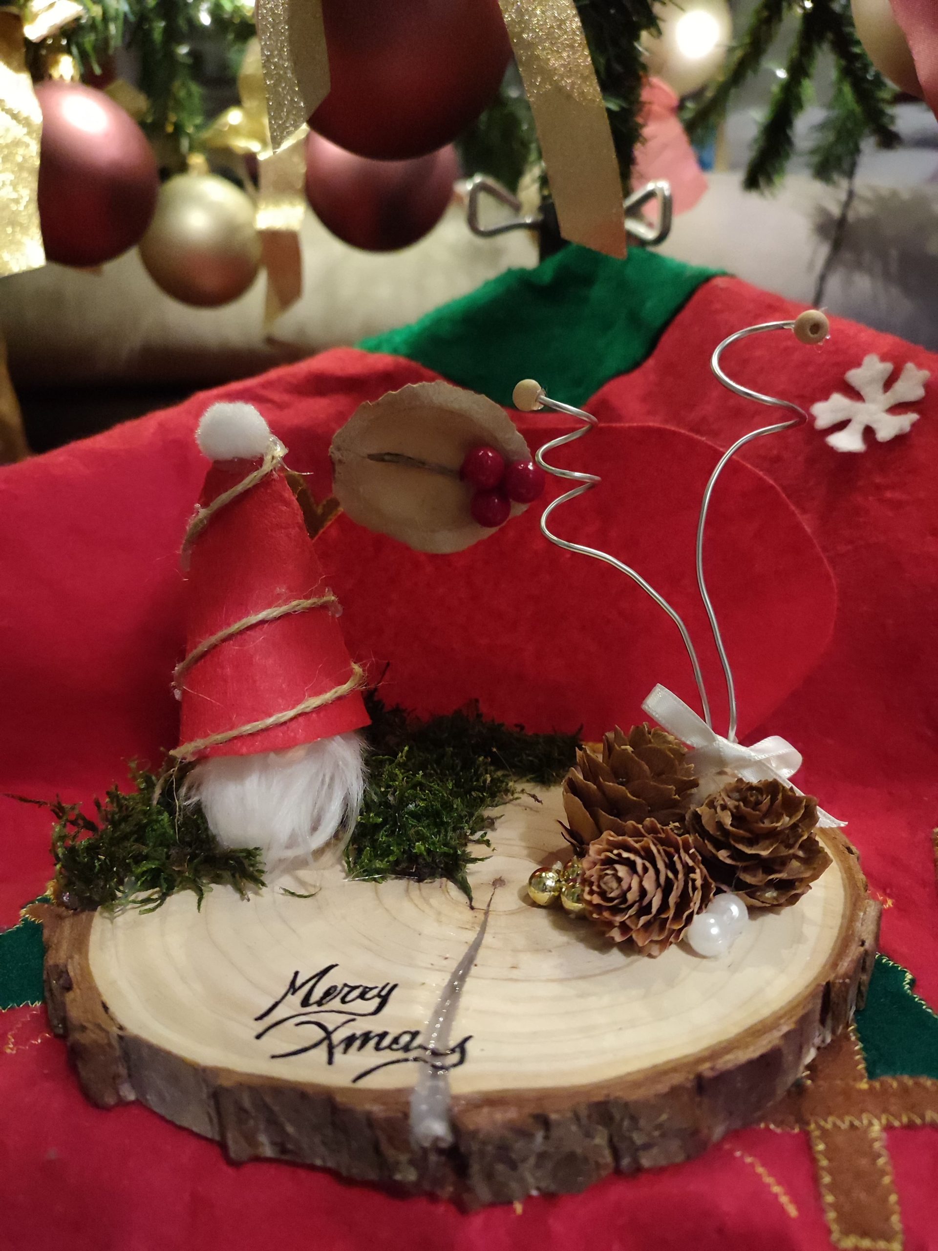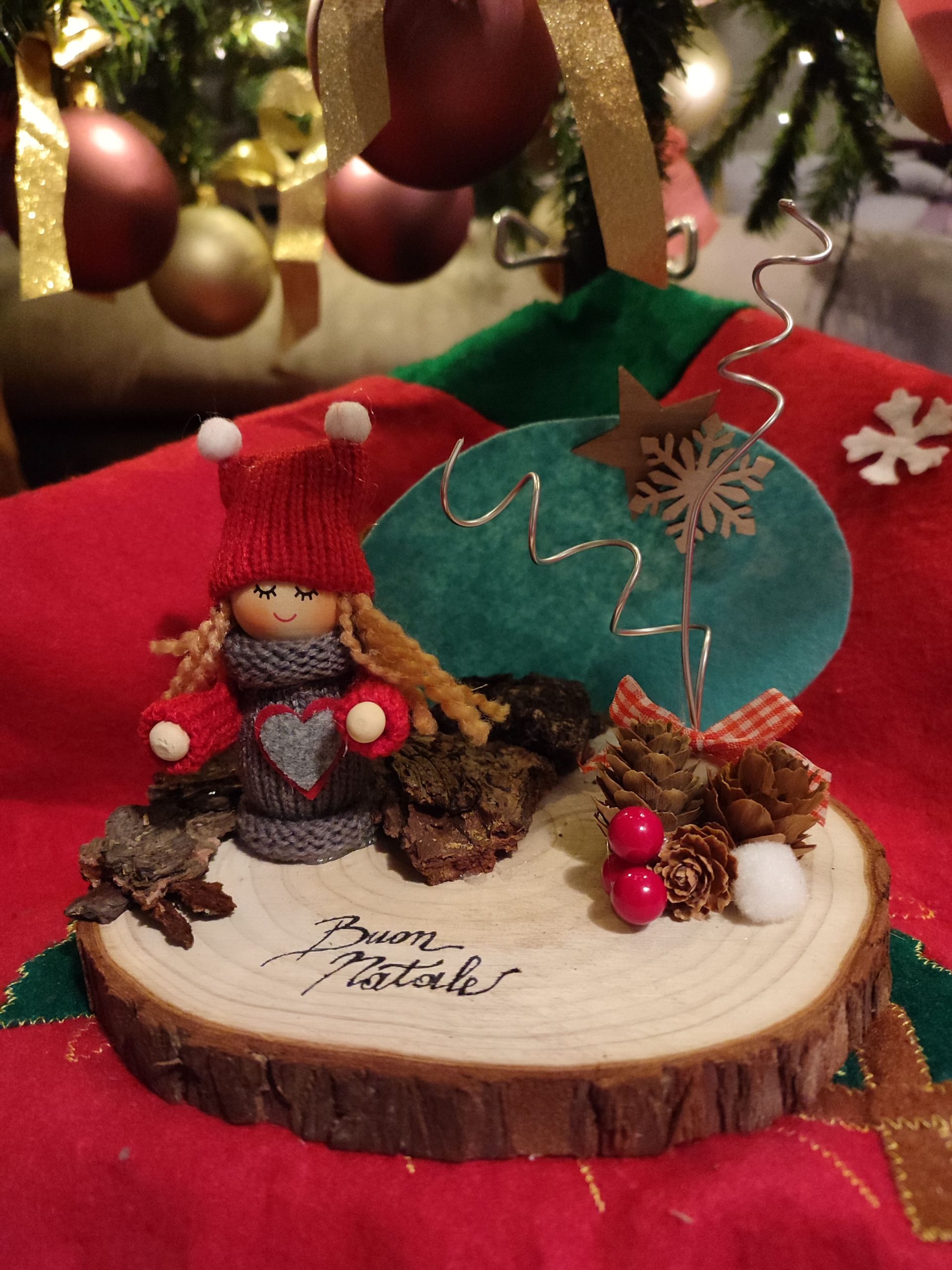 Ed eccoci qui con un'altra creazione natalizia: può essere una graziosa decorazione da utilizzare come soprammobile oppure come centrotavola del giorno di Natale. Queste sono semplici fette di legno con gnometti realizzati in feltro o fatine decorative, il tutto abbellito con pigne, fiocchetti e fili di alluminio che, all'occorrenza, possono diventare dei portabigliettini. Il loro costo è di € 20,00 l'uno: a brevissimo sarà possibile acquistarli. Vi piacciono? Fatemelo sapere !